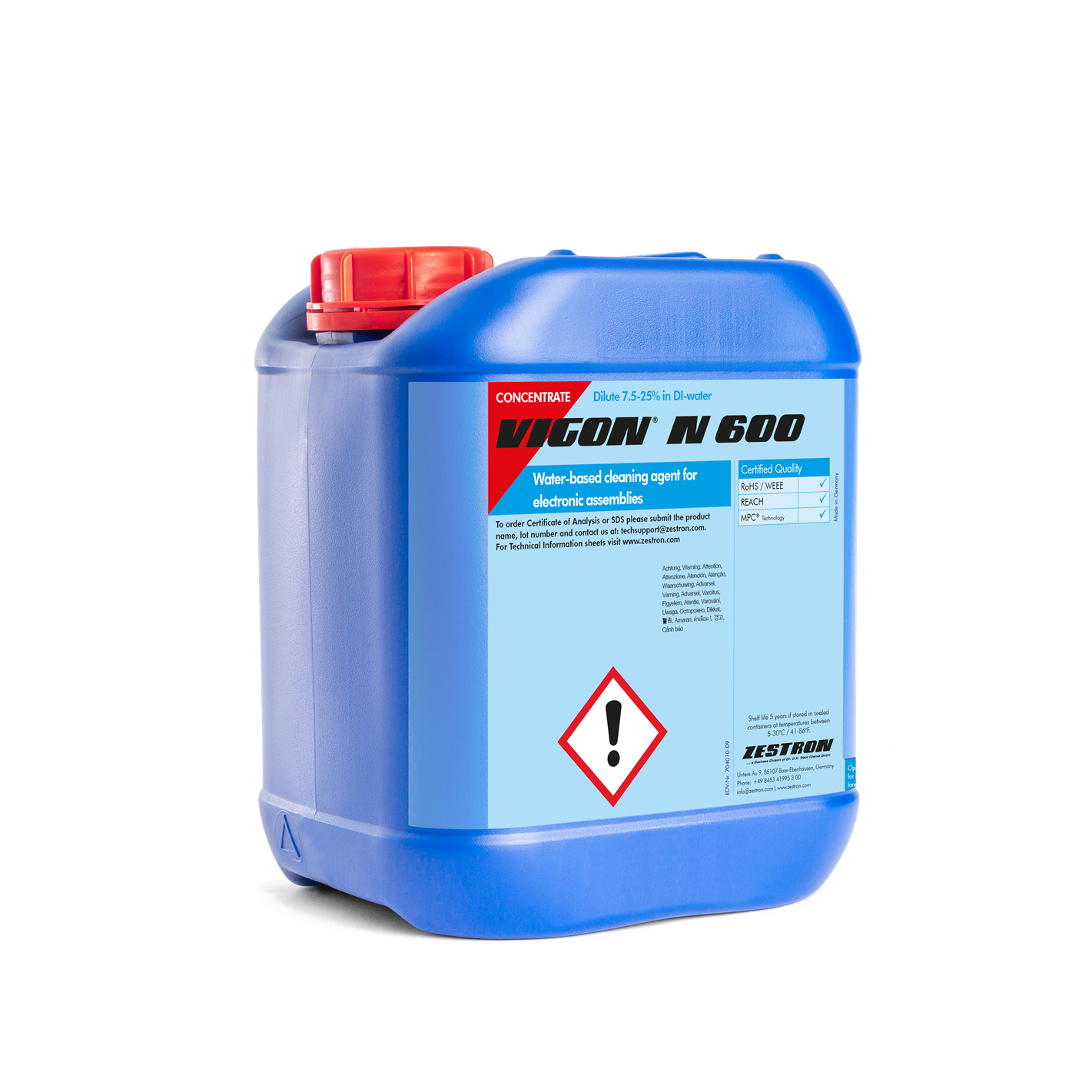 Vigon N 600 er en avanceret aflufter med en revolutionerende pH-neutral formel. Rengøringsmidlet blev udviklet til brug i spray-in-air inline- og batch-rengøringsapplikationer. Det har fremragende rengøringsevne og evnen til at fjerne en bred vifte af fluxrester fra elektroniske enheder under pH-neutrale forhold. På grund af sin neutrale pH-værdi udviser rensemidlet også høj materialekompatibilitet med følsomme metaller og polymerer.